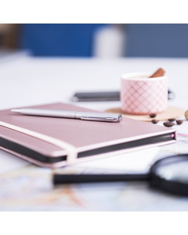 El Bloc de Notes Bodley A5 fabricat en polipell amb acabat metal·litzat en colors daurat, platejat i or rosa, destaca per la seva tapadura rígida, elàstic de subjecció i punts de llibre de tela a joc. Les 80 fulles llises en to natural ofereixen una superfície d'escriptura suau i uniforme. Ideal per a regals d'empresa, promocions i marxandatge, és personalitzable amb el teu logotip, convertint-lo en una eina de branding sofisticada i útil per a clients i empleats.