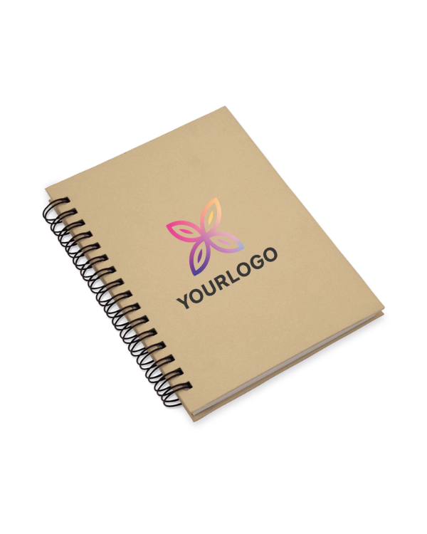 Llibreta d'anelles fabricada de cartró reciclat, amb 80 fulles de ratlles. Llibreta personalitzada ecològica per a regal a clients amb el seu logotip o missatge estampat per a promoció de la seva empresa.
