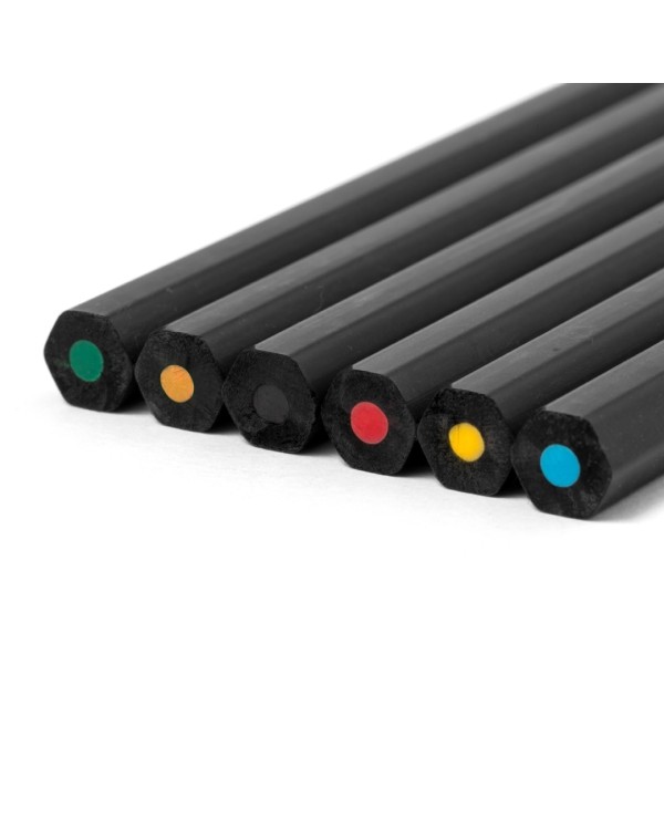 Set de 6 lápices de madera acabada en color negro, con cuerpo hexagonal y minas en varios colores. Presentados en estuche negro de cartón reciclado negro con cierre de solapa.