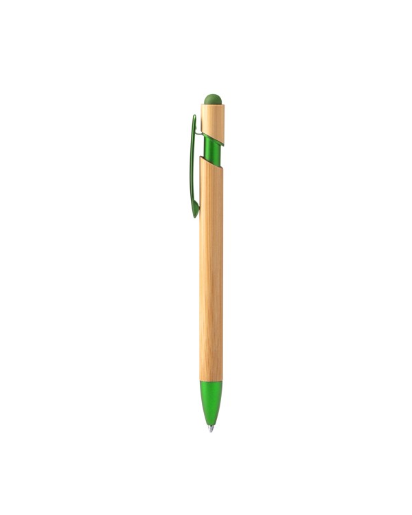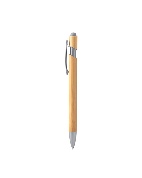 Bolígraf amb cos de bambú, punter tàctil i càrrega jumbo, ideal per a publicitat i regals d'empresa personalitzats.