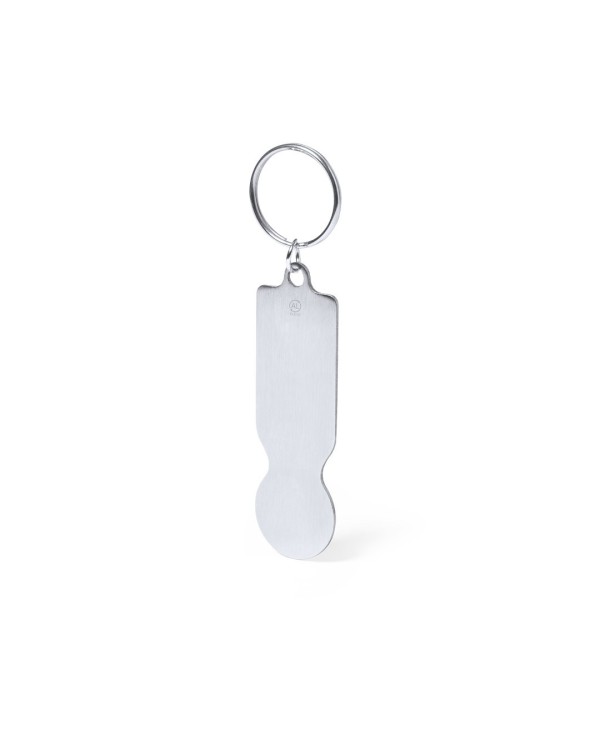 El Clauer Moneda en alumini reciclat amb acabat platejat i àmplia superfície de marcatge ho fan perfecte per personalitzar amb logos o noms comercials. Inclou una anella metàl·lica a joc, garantint resistència i comoditat a l'ús diari.