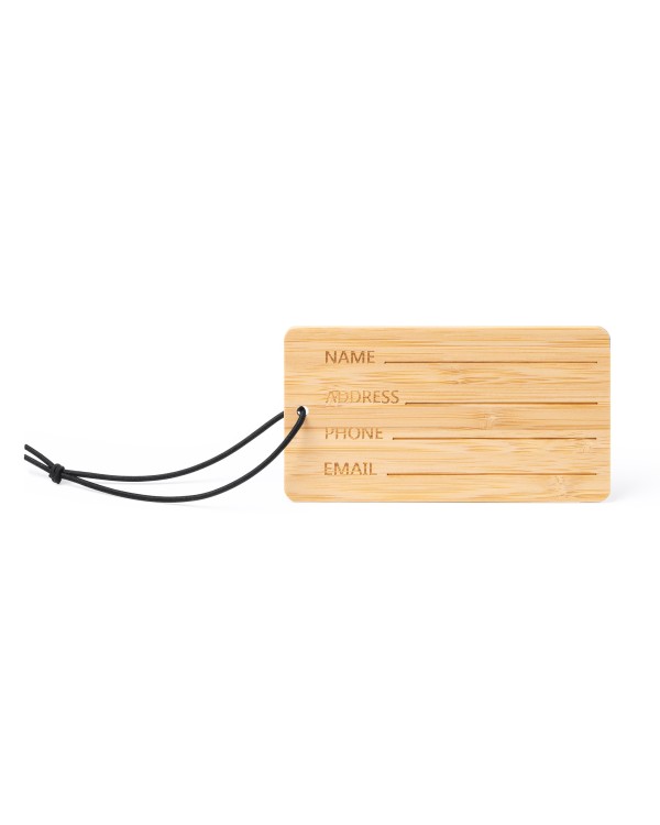 Identificador de maletes de bambú amb banda elàstica negra. Personalitzable mitjançant làser o tampografia. Ideal per a regals d´empresa d´agències de viatges i companyies.