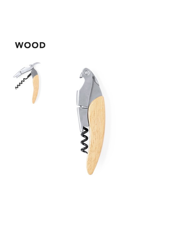 Obridor multifunció d'Inox i mànec de fusta personalitzable amb el seu logotip, creant un regal publicitari elegant i funcional que destacarà en esdeveniments i promocions, mantenint la teva marca a la ment dels teus clients.