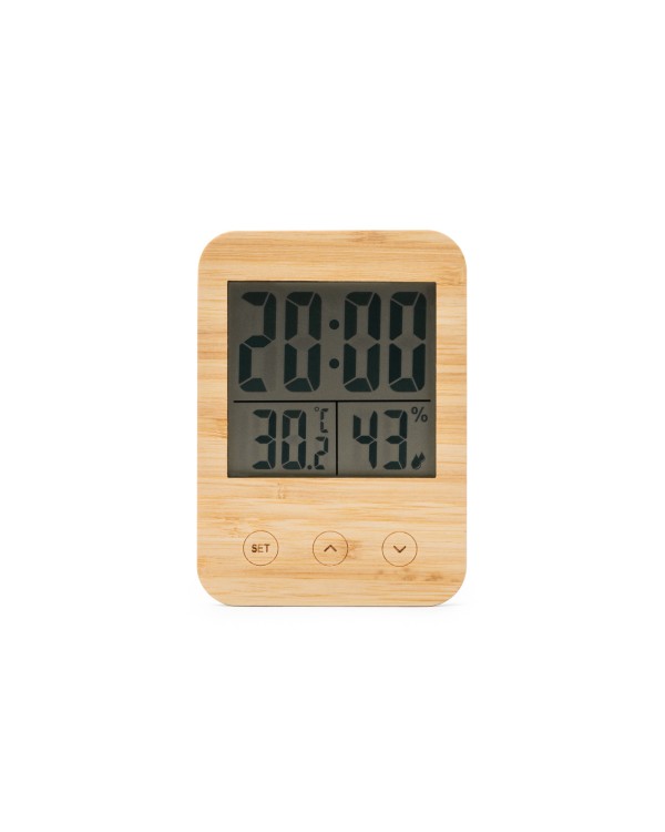 Estació meteorològica digital personalitzable, amb carcassa de bambú, funció de rellotge i sensors de temperatura i humitat. Ideal per a promocions i regals d´empresa.