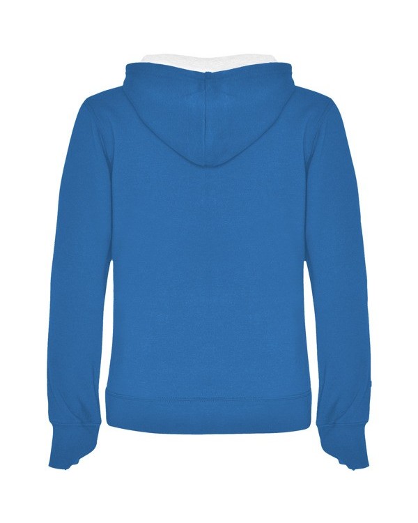 La Dessuadora Urban Woman de Roly és una peça entallada amb tall femení, confeccionada en 50% cotó i 50% polièster amb un gramatge de 280 g/m² . El seu disseny inclou una caputxa bicolor amb cordó contrastat ajustable, una butxaca tipus cangur i punys i cintura de punt canalé amb elastà 1x1. A més, presenta un detall d'obertura per al polze als punys.