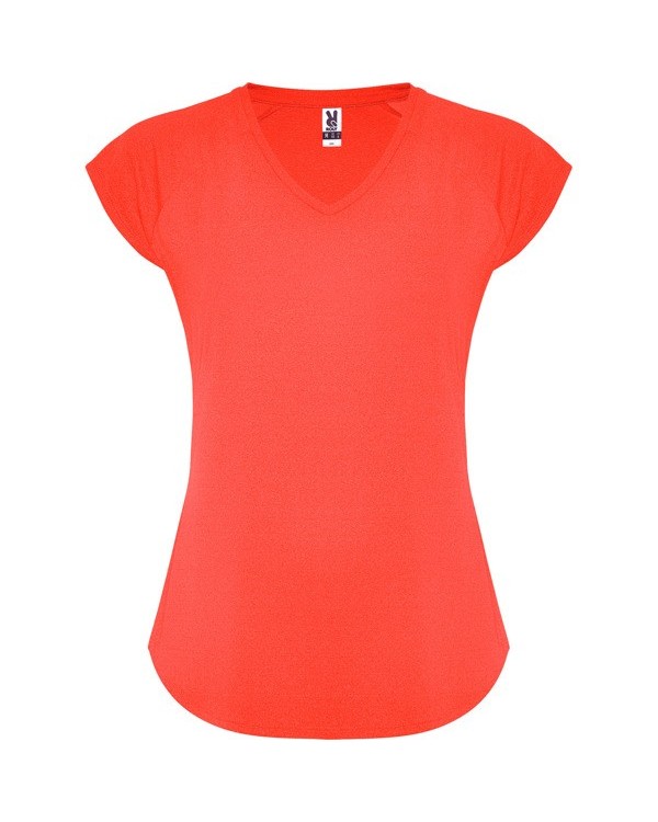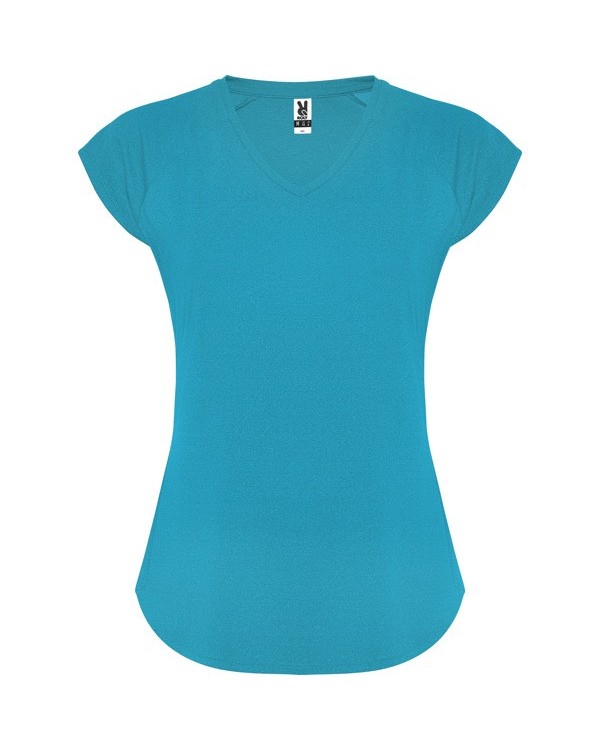 Samarreta tècnica per a dona amb disseny entallat, màniga ranglan i coll pic.