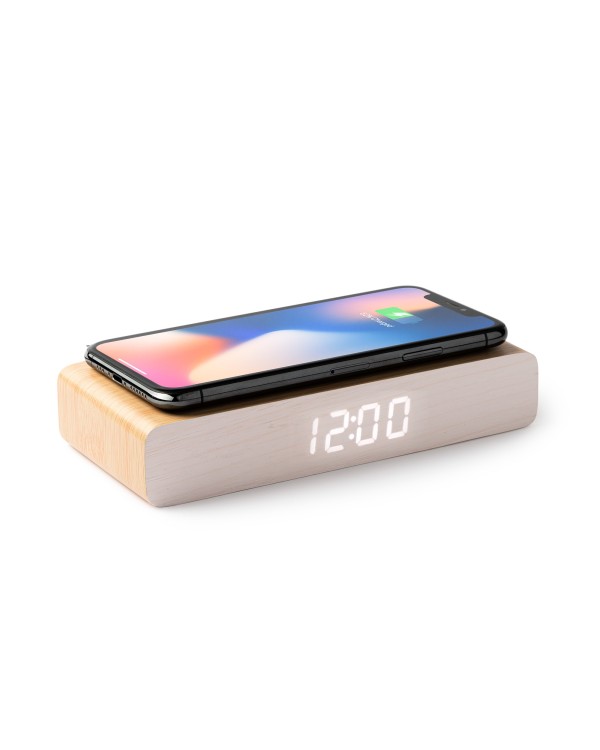 Carregador sense fil de 5W en fusta MDF amb rellotge multifunció, alarma, data i temperatura. Personalitzable amb logotip, ideal per a publicitat i regals d'empresa.