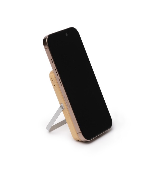 Bateria externa de bambú amb suport vertical i càrrega sense fil magnètica de 15W, personalitzable amb el teu logotip.
