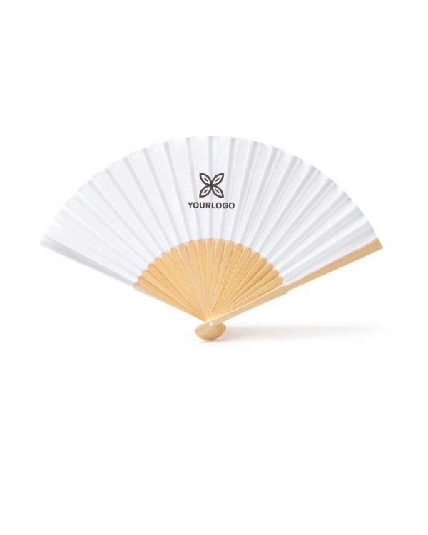 Ventall plegable amb varetes de bambú i tela de polièster personalitzable amb el teu logotip, ideal com a regal publicitari ecològic per a esdeveniments i campanyes d'estiu.