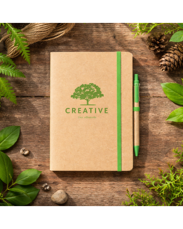 - Material ecológico: Libreta y bolígrafo fabricados en cartón reciclado y caña de trigo.