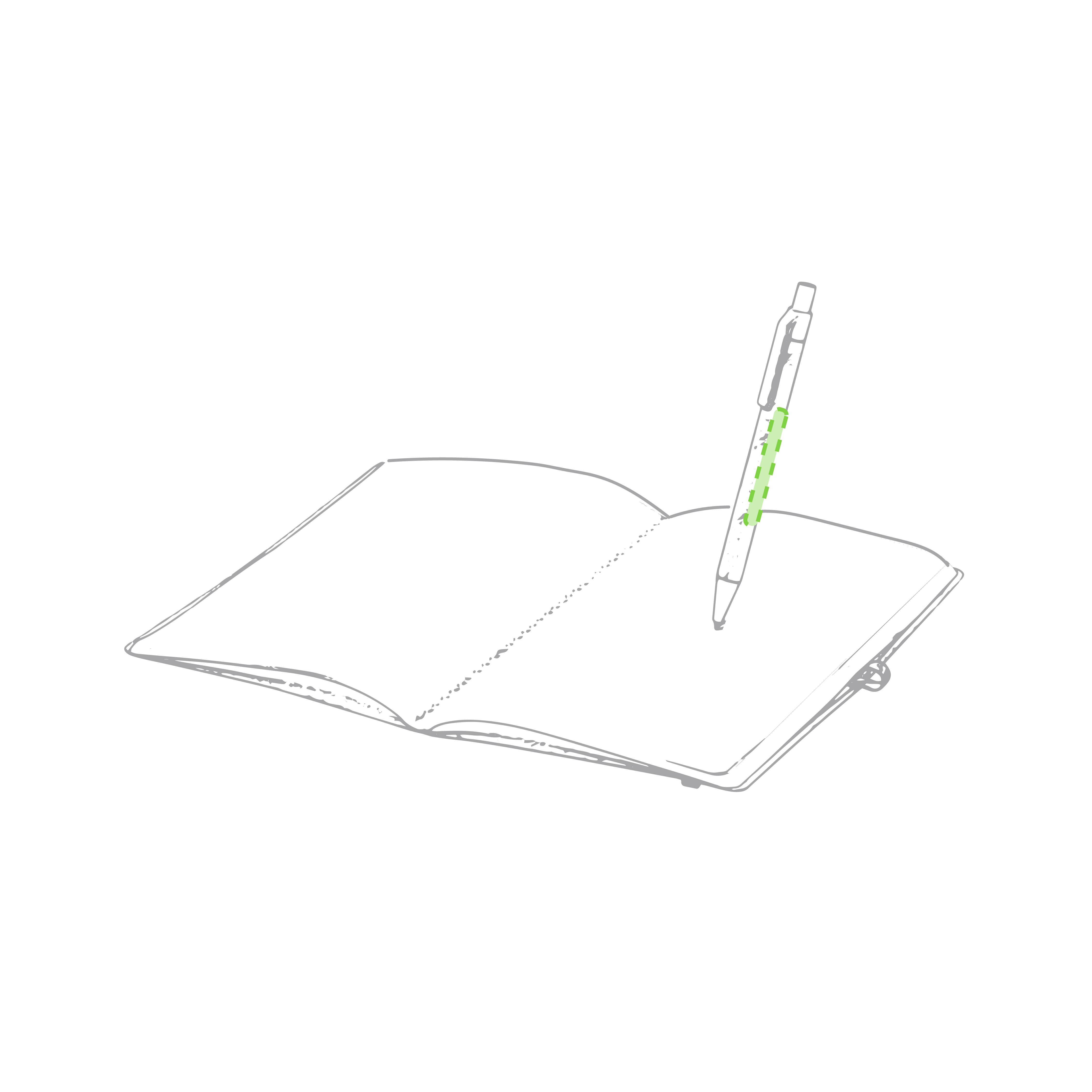 - Bolígrafo incluido: Mecanismo pulsador, cuerpo de cartón reciclado y tinta azul.