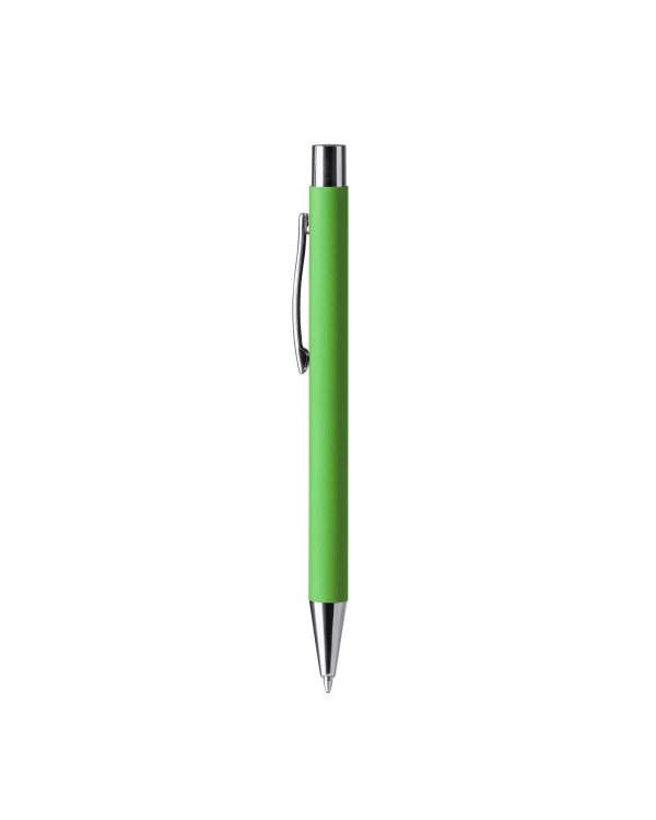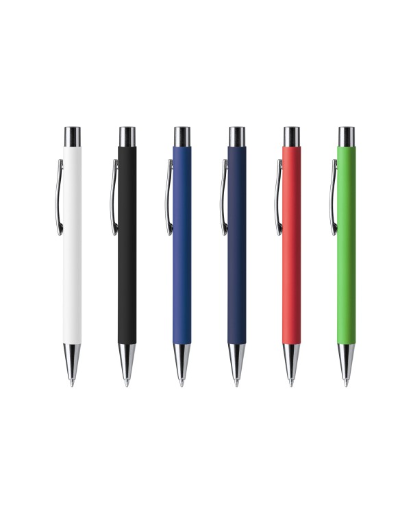 Bolígrafo metálico con tacto suave, detalles cromados y tinta azul. Personalizable con marcaje láser o tampografía. Ideal para publicidad y regalos de empresa.