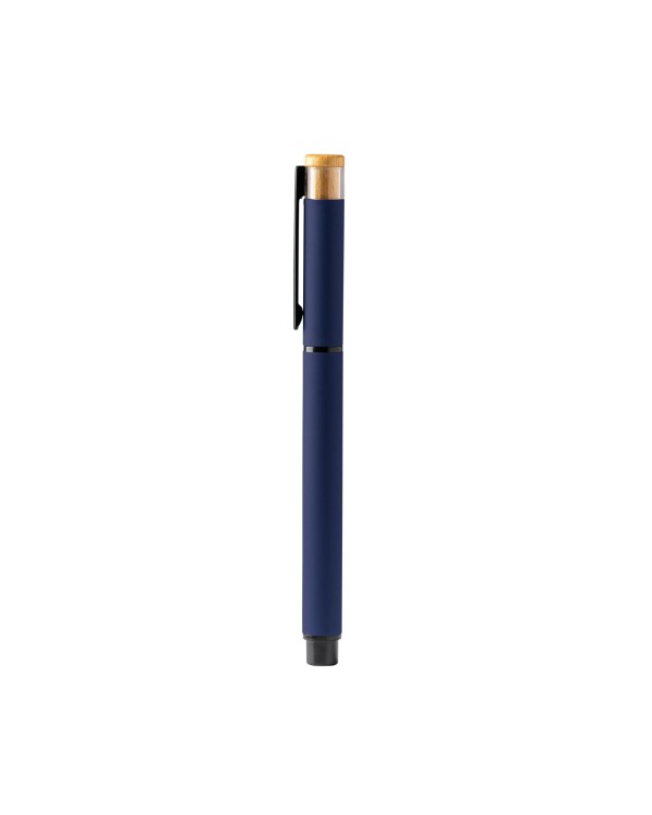 Bolígrafo roller personalizable con cuerpo de aluminio reciclado, clip metálico y detalle en bambú. Incluye carga jumbo de tinta azul. Ideal para publicidad, merchandising y regalos de empresa.