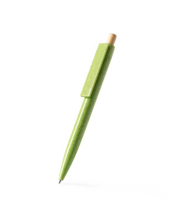Bolígrafo fabricado con plástico y fibra de trigo y bambú, con tinta azul y clip ancho para marcaje. Personalizable con logo mediante tampografía, ideal para publicidad y regalos empresariales.