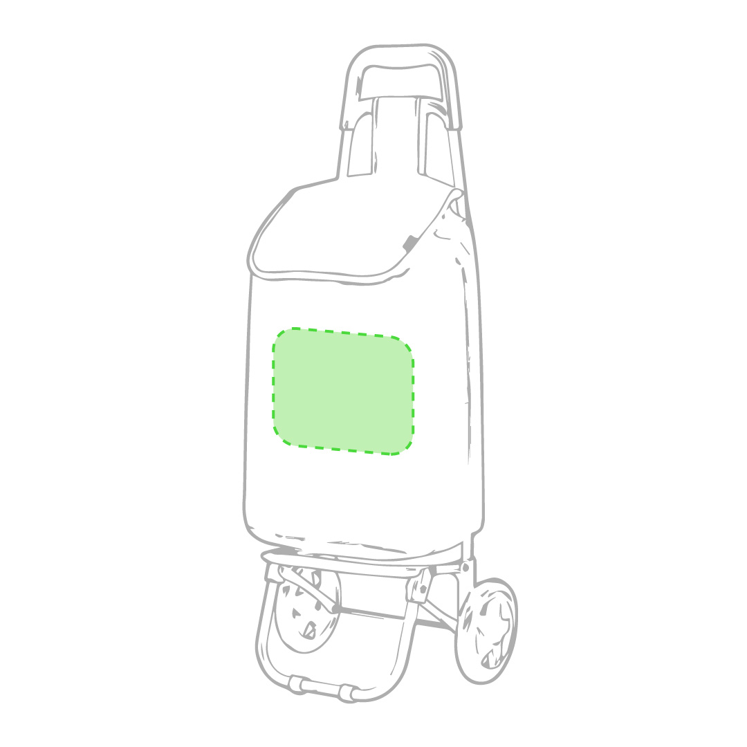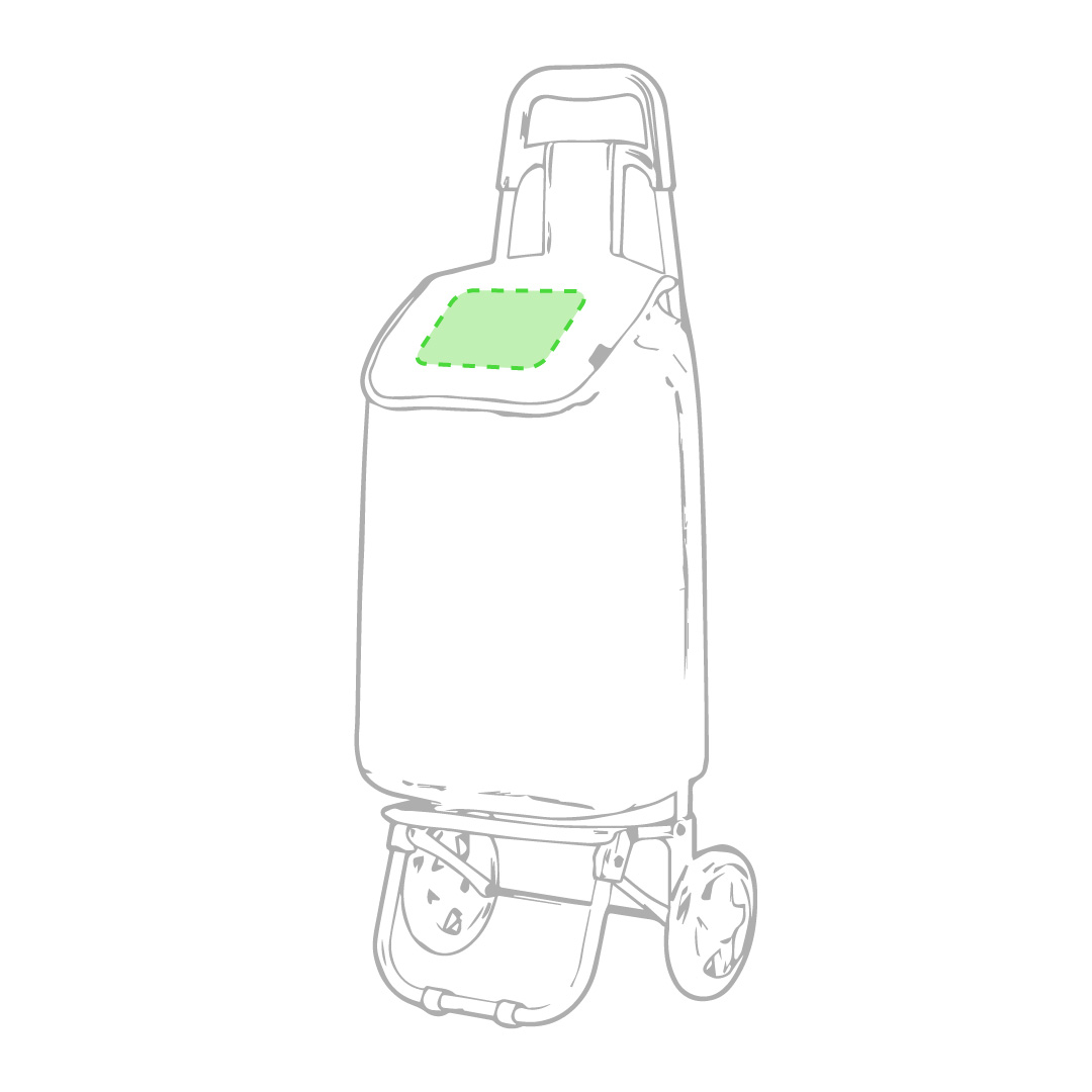 Carro de compra plegable en poliéster 600D RPET reciclado, con asa reforzada, ruedas resistentes, bolsillo trasero y estructura metálica. Personalizable con tu logo, ideal para merchandising.