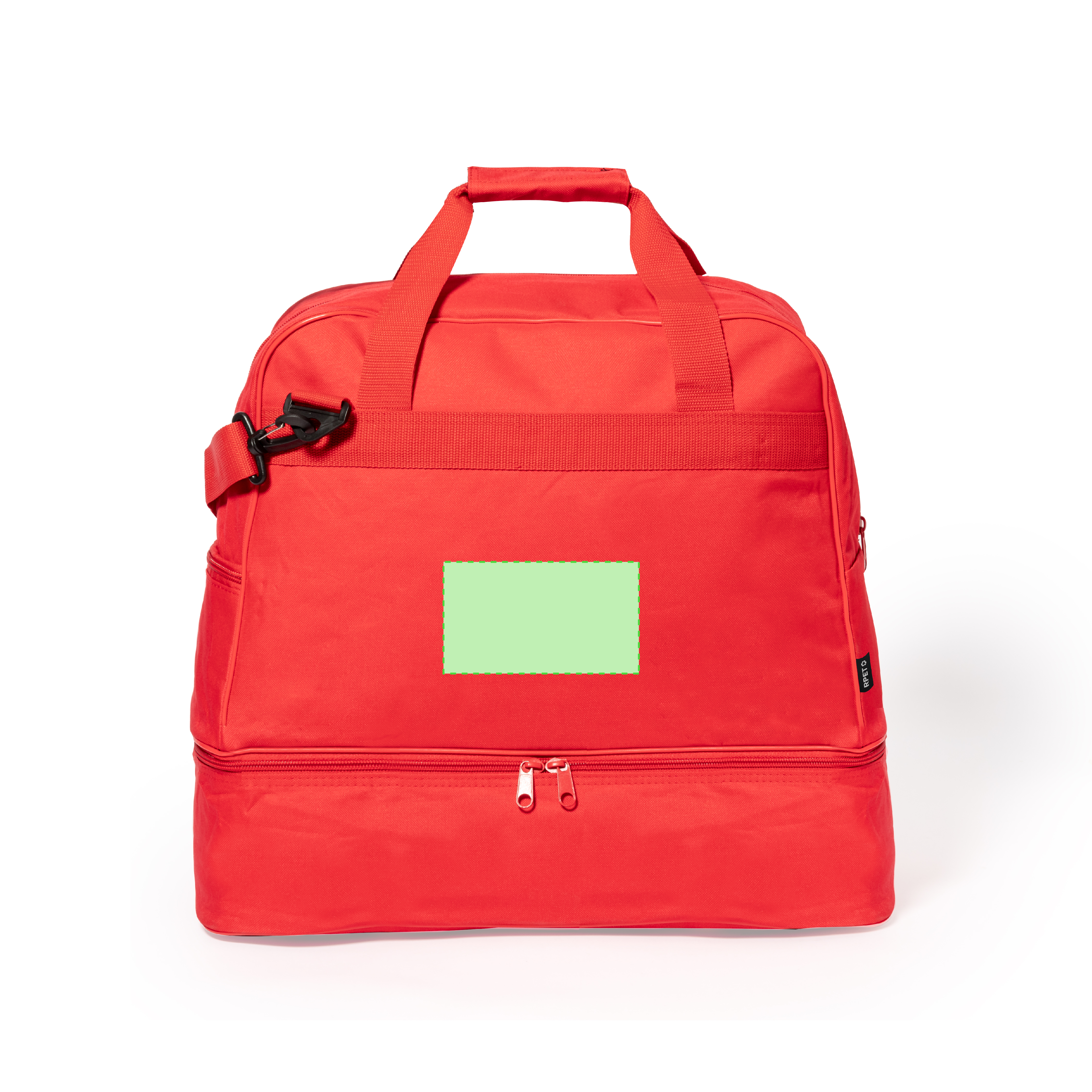 Bolsa de poliéster 600D RPET con amplio compartimento principal, base con compartimento para calzado y bolsillo lateral con cremallera. Personalizable, sostenible y perfecto para complemento de clubes deportivos.