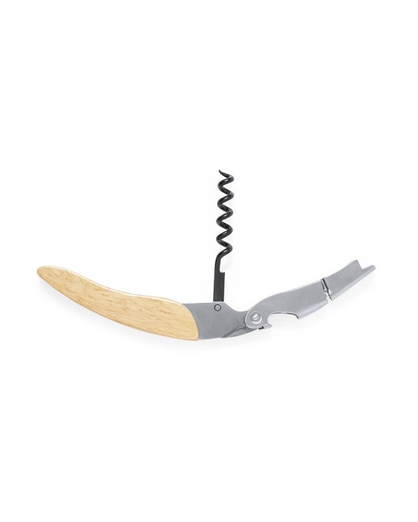 Abridor multifunción de Inox y mango de madera personalizable con su logo, creando un regalo publicitario elegante y funcional que destacará en eventos y promociones, manteniendo tu marca en la mente de tus clientes.