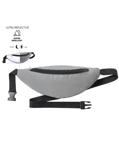 Riñonera reflectante de poliéster 210T, resistente al agua, con bolsillo con cremallera y cinta ajustable con hebilla. Personalizable con logo, ideal para eventos y promociones.