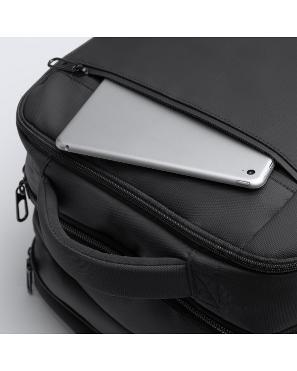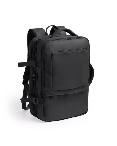 Mochila de viaje extensible en PU Leather con capacidad de 40L, compartimento acolchado para laptop de 17", bolsillos antirrobo y cinta para trolley. Personalizable con logo para publicidad y regalos de empresa.