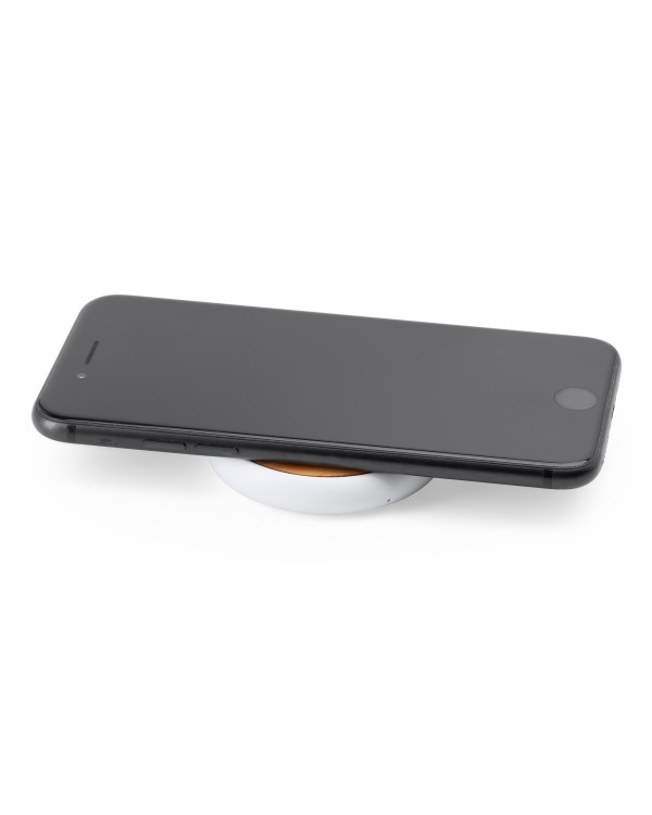 Cargador inalámbrico de 5W en ABS blanco con superficie en bambú, puerto Tipo C, indicador luminoso y presentación en caja eco. Personalizable para promociones y regalos de empresa.