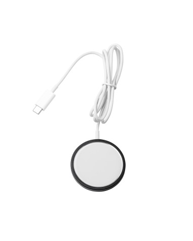 Cargador inalámbrico magnético de 15W en aluminio reciclado, con cable Tipo C integrado y presentación eco. Personalizable con logo, ideal para promociones y regalos de empresa.
