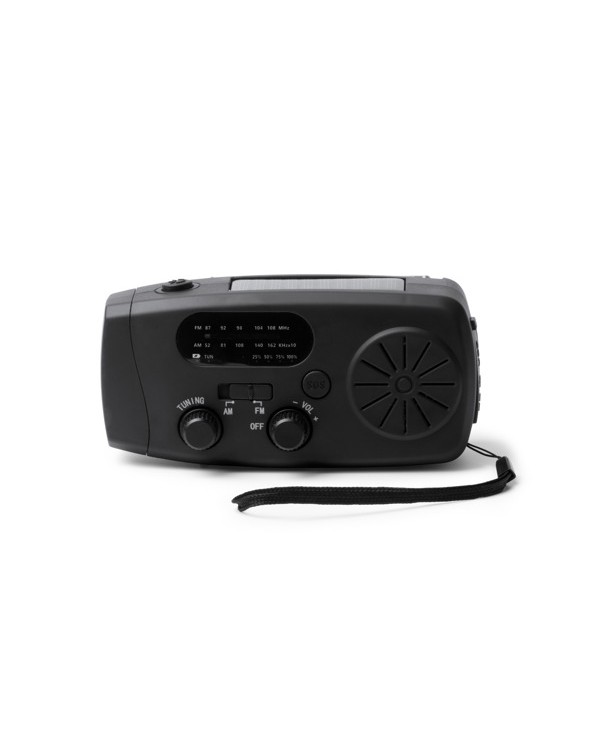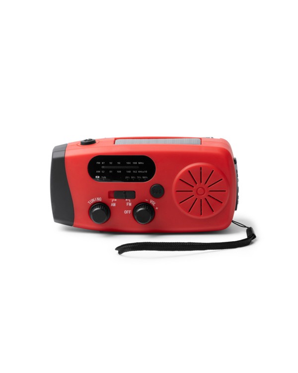 Radio de emergencia multifunción con dinamo, panel solar y power bank, personalizable con tu logo.