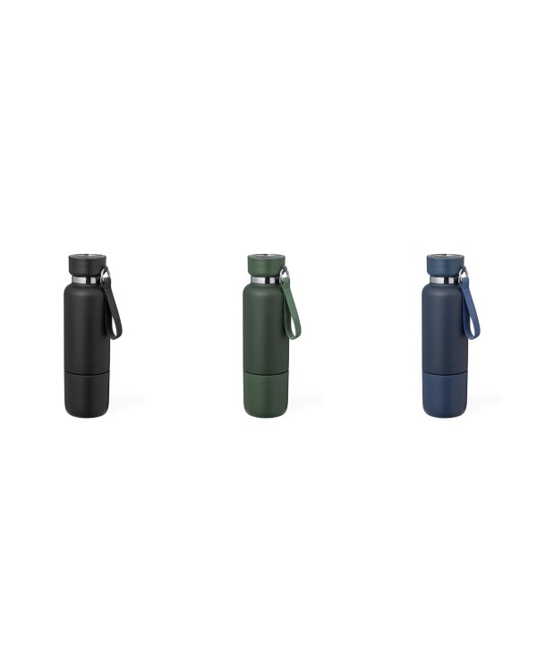 Una de sus características más originales es el vaso de 300 ml integrado en la base, fabricado en resistente PP y del mismo color, con un práctico acoplamiento de rosca. Este bidón está disponible en colores mate modernos que lo convierten en un regalo publicitario único y atractivo. Personalízalo con el logo o marca de tu empresa para destacar en campañas promocionales o regalos corporativos. Presentado en una elegante caja kraft, es una solución práctica y con estilo para reforzar tu imagen de marca.