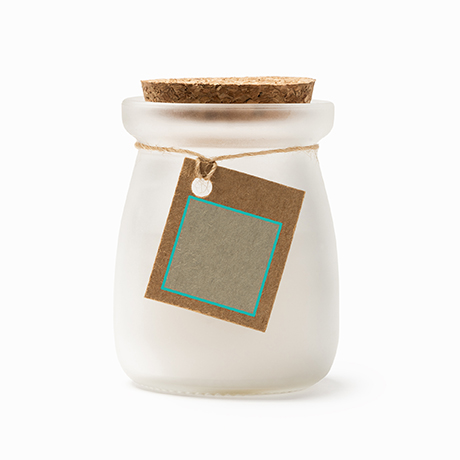 Vela aromática de vainilla en recipiente de cristal con tapón de corcho. Personalizable con tu logo en tarjeta o tapa. Ideal para publicidad y regalos personalizados.