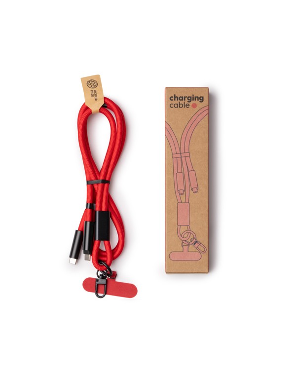 Lanière en nylon recyclé avec câble de chargement Type C intégré, personnalisable et idéale pour la publicité et les cadeaux d'entreprise.