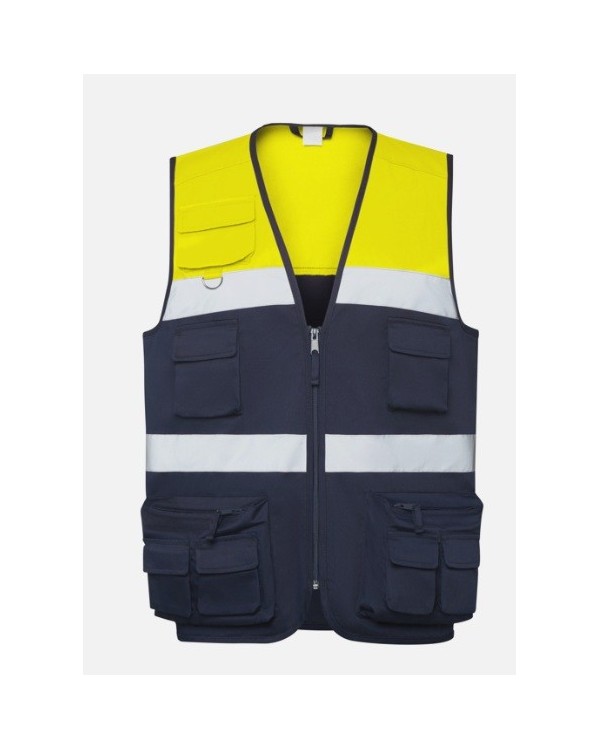 Gilet multi-poches haute visibilité, en polyester et coton, avec bande réfléchissante et multiples poches fonctionnelles. Personnalisable avec logo pour promotions, cadeaux d'entreprise et merchandising d'entreprise. Conforme aux normes CE. Disponible dans les tailles S à 3XL et les couleurs 55221 et 55223.