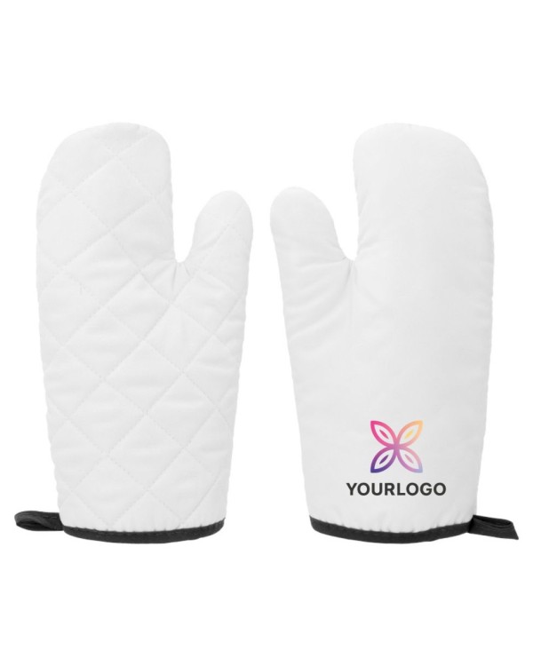 Gant de cuisine personnalisable en polyester blanc avec détails colorés. Le côté est compatible avec la sublimation en couleur. Idéal pour les cadeaux promotionnels et publicitaires.