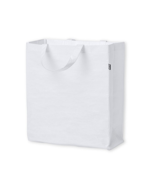 Sac publicitaire en RPET laminé, avec poignées courtes renforcées et soufflet latéral. Capacité de charge : 5 kg. Personnalisable avec un logo. Idéal pour les campagnes promotionnelles durables et les cadeaux d’entreprise.