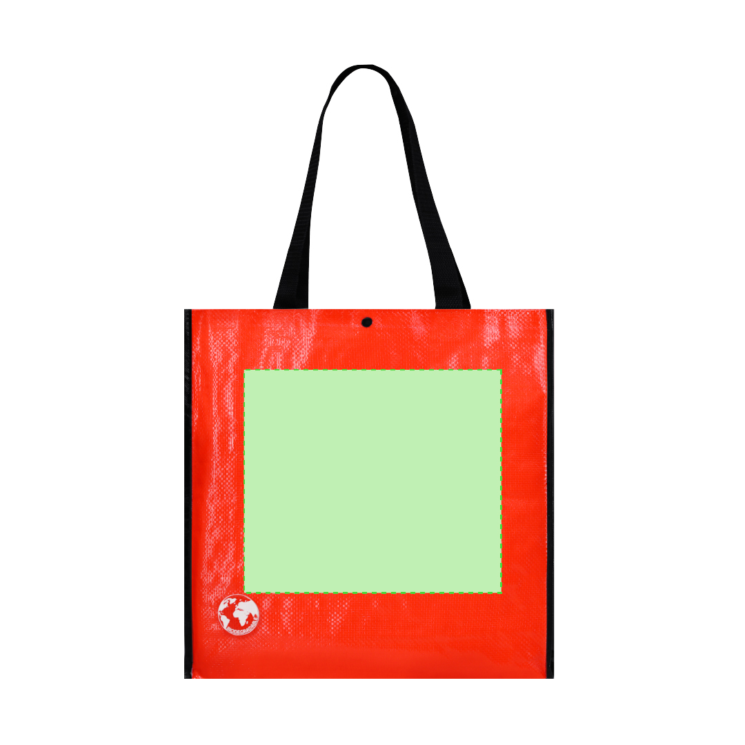 Sac laminé réutilisable et biodégradable avec anses longues renforcées, fermeture à pression et soufflet passepoilé. Personnalisable pour la publicité et le merchandising.