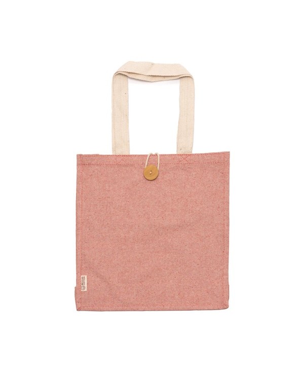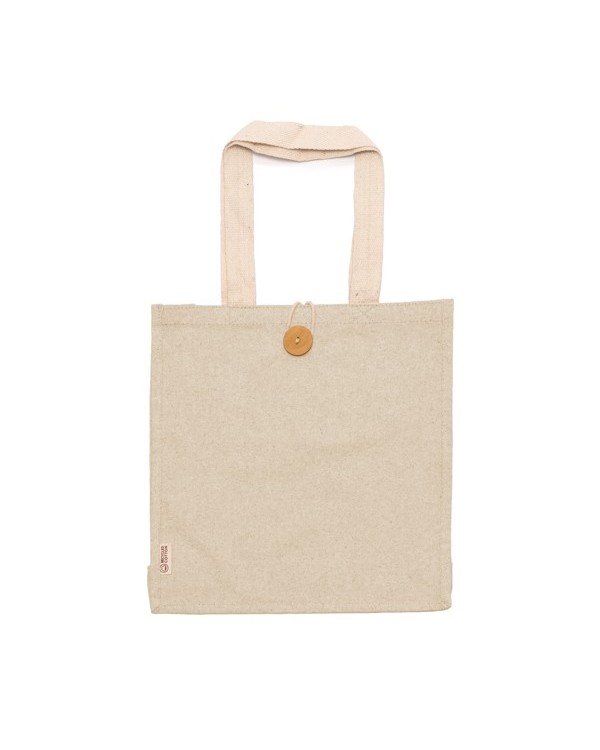 Sac en coton recyclé avec longues anses renforcées et fermeture à bouton. Personnalisable avec logo pour promotion, merchandising et cadeaux d'entreprise.