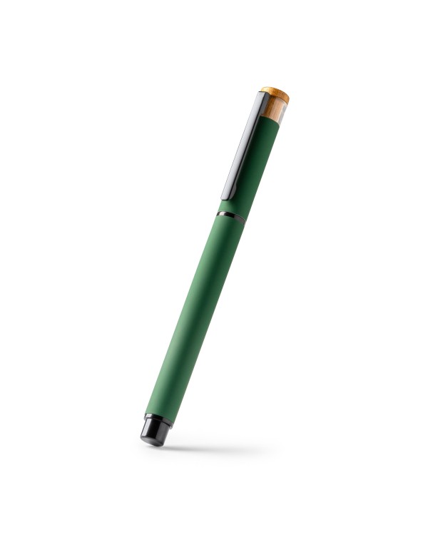 Stylo roller personnalisable avec corps en aluminium recyclé, clip en métal et détail en bambou. Comprend une recharge géante d'encre bleue. Idéal pour la publicité, le merchandising et les cadeaux d'entreprise.
