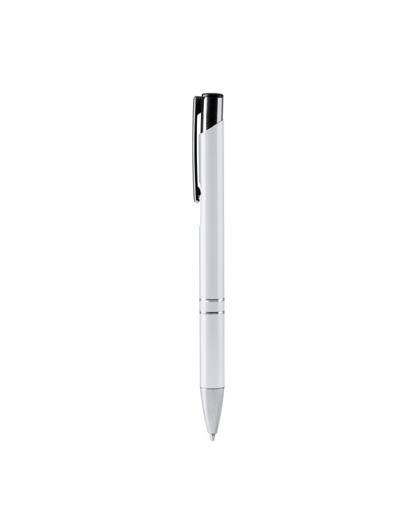 Stylo à bille en aluminium recyclé avec finition anodisée, encre bleue et mécanisme à bouton-poussoir. Personnalisable par impression laser ou tampographie. Idéal pour la publicité et le merchandising.