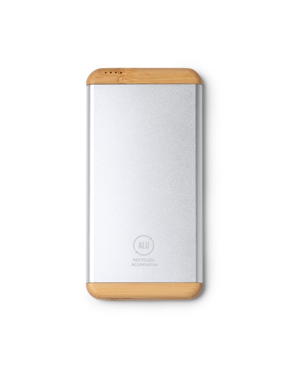 Batterie externe de 5 000 mAh en aluminium et bambou recyclés, avec ports Type C et USB, voyant lumineux et emballage écologique. Idéal pour personnaliser et promouvoir votre marque.