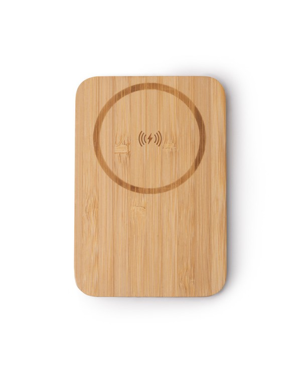 Batterie externe en bambou avec support vertical et charge sans fil magnétique de 15 W, personnalisable avec votre logo.