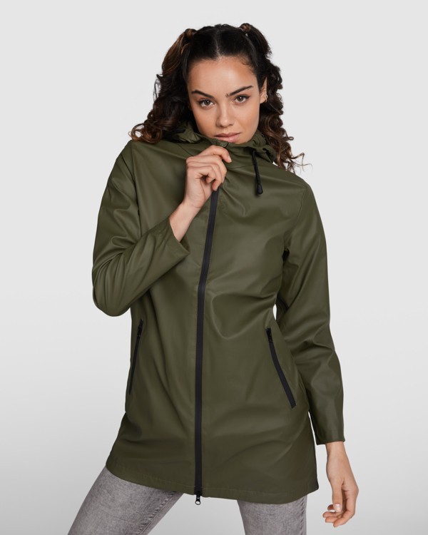 L' imperméable Sitka Woman est un vêtement imperméable et ajusté avec une capuche et une visière fixes. Personnalisable avec votre logo, il est parfait pour les vêtements d'entreprise, les cadeaux promotionnels et le merchandising. Avec des coutures thermosoudées, des poches zippées et des détails contrastés, il offre style et protection.