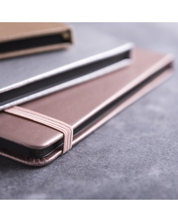 The Bodley A5 Notepad combines elegance and modernity with a sophisticated design in metallic leatherette finish in gold, silver and rose gold. Its rigid cover, together with the elastic fastening and matching fabric bookmark, make it a practical and functional accessory for everyday use. With 80 plain sheets in a natural colour, it is ideal for taking notes in style. Personalise it with your logo or brand and turn it into a corporate gift, company gift or premium merchandising. Perfect for impressing at events and building customer loyalty.