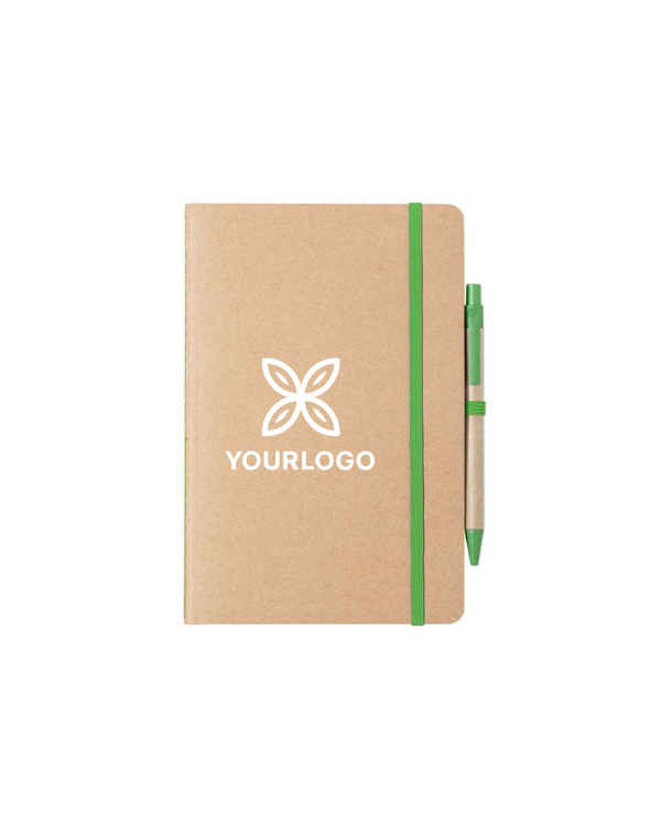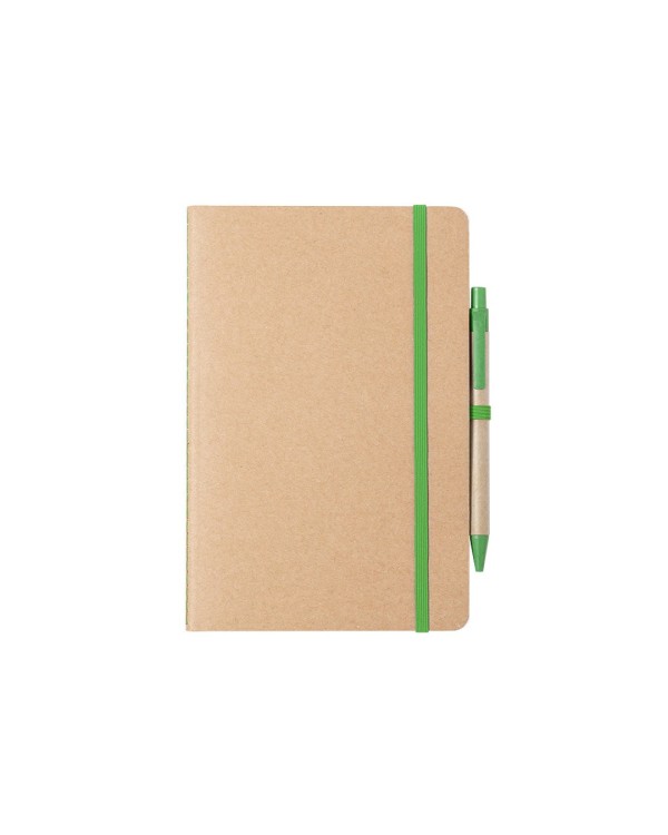 - Eco-friendly material : Notebook and pen made of recycled cardboard and wheat straw .