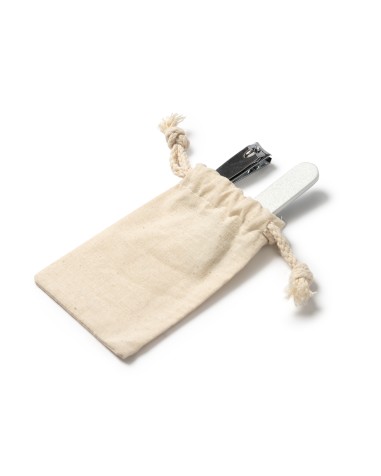 Manicure set with nail file and clippers, in a resealable cotton bag. Customizable with your logo. Perfect for advertising and promotional gifts.