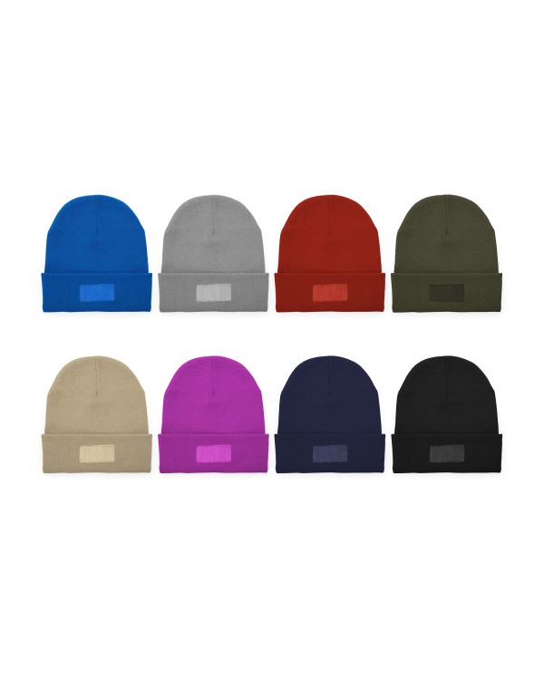 Double-layer acrylic knit hat with customizable front band. One size fits most, ideal for corporate wear, events, and corporate gifts.