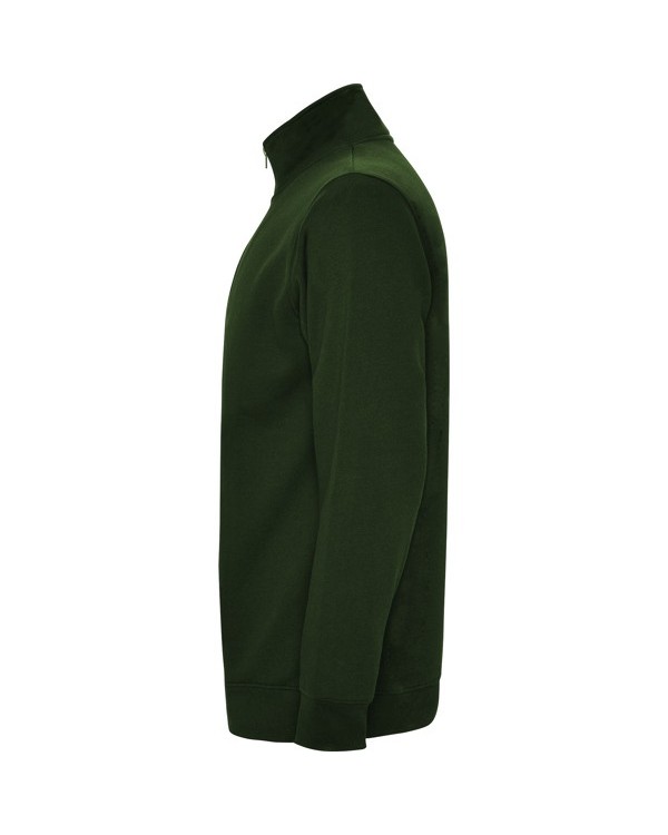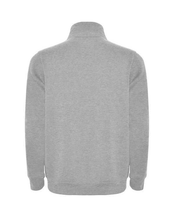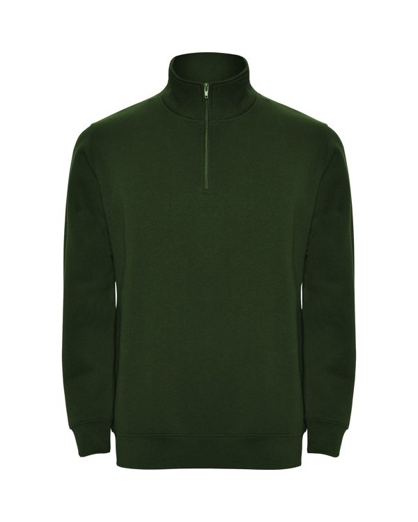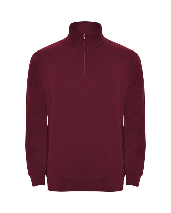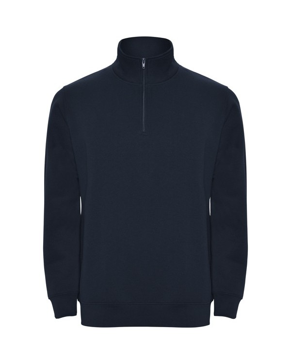 The Aneto Sweatshirt by Roly is a unisex garment made of 50% cotton and 50% polyester with a weight of 280 g/m². Its design includes a matching half-zip with a high collar, 1x1 ribbed cuffs and waistband, and a matching inner collar.