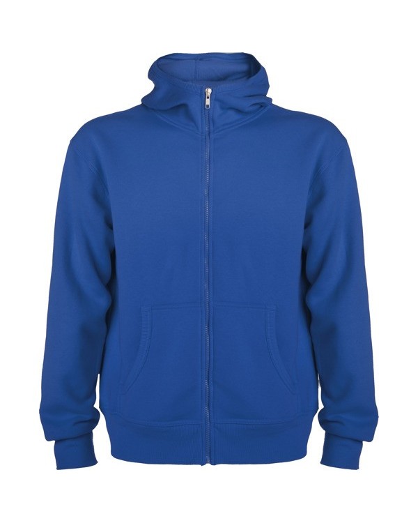 The Roly Montblanc Sweatshirt, made of 50% cotton and 50% polyester with a weight of 280 g/m², offers comfort and durability. Its design includes a high-neck, full-zip hood, ribbed details on the hood and pockets, a kangaroo pocket, and 2x2 ribbed cuffs and waistband. Available in various colors and sizes (S-3XL), it's ideal for everyday use, work activities, and promotions.