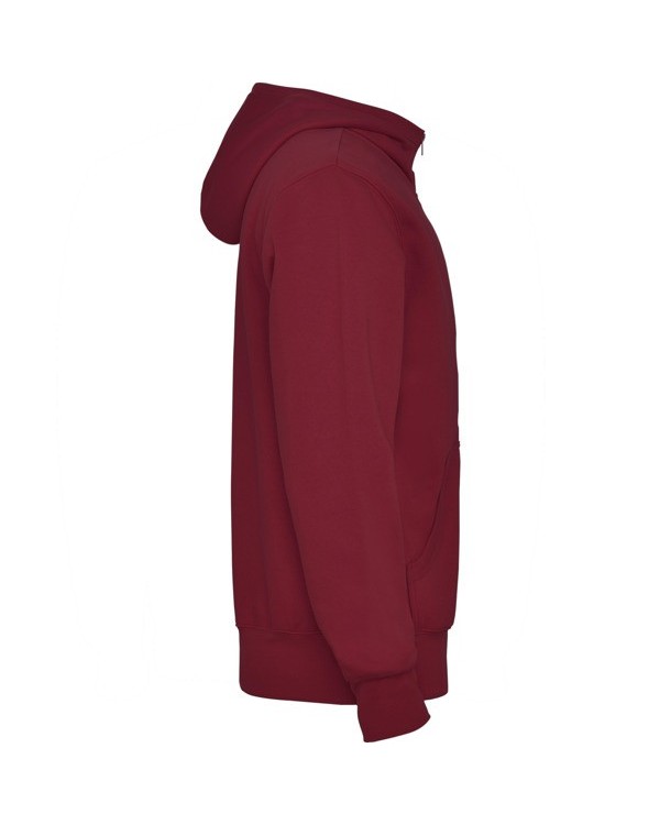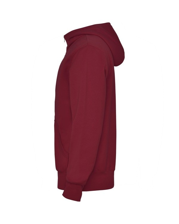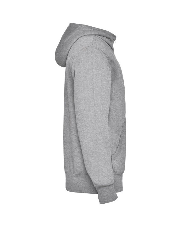 The Montblanc Sweatshirt by Roly is a unisex long-sleeved garment made of 50% cotton and 50% polyester with a weight of 280 g/m². Its design includes a high-neck, full-zip hood, a kangaroo pocket, and 2x2 ribbed cuffs and waistband.