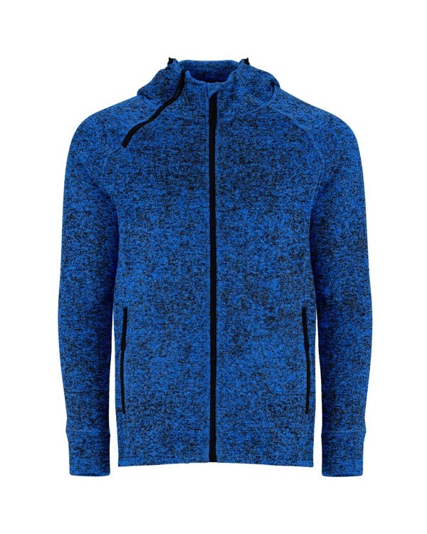 The Roly Everest Sweatshirt is a unisex garment made of 100% polyester with a weight of 280 g/m². Its design includes a lined hood, a center zipper with a chin guard, a high collar with designer adjusters, and two front zippered pockets. It also features a longer back hem than the front with adjusters for greater comfort.