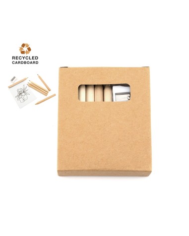 Discover the Figgy Set , an ideal set to stimulate creativity and fun in children and adults alike. This set includes a coloring pad, a pencil sharpener and six wooden pencils with a cylindrical body and different colored leads, all presented in a recycled cardboard box with a natural finish and a window to see its contents. Perfect for giving away at school events or as part of corporate promotions, the Figgy Set is a brilliant way to show your commitment to sustainability while offering a product that inspires creativity.