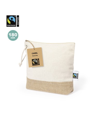 The Chiril Fairtrade Toiletry Bag is a functional accessory, made of 21.5 x 16.5 x 5 cm laminated jute and cotton. Personalize it with your logo for a personalized gift with your brand or product logo, promoting sustainability and fair trade and helping you increase your business sales.