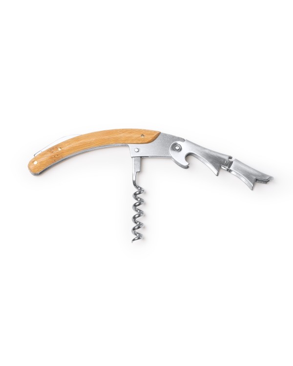Customizable stainless steel corkscrew with a bamboo handle. Double-lever mechanism, presented in an eco-friendly box, and a branding area to promote your brand. Ideal for corporate gifts and promotional campaigns.